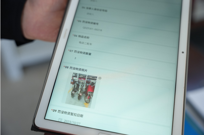 以往在城管执法过程中,对于电瓶车、手推车等涉案物资的管理是难点。为了杜绝因“打招呼”“找关系”而产生的涉案物资管理混乱情况,千灯镇综合行政执法局自主创新设计“罚没物资入库登记小程序”,对物资“进库”“出库”的原因、对应法规、时间、当事人、经办人进行详细记录,并附上二维码标识牌,扫码便可识别对应物品所有信息;想要提取物资“出库”,须满足规章要求方可操作。记得“准”、管得“好”、说得“清”,如今,该局各执法中队罚没物资从入库、审批到处置均实现了全链条闭环数字化管理。
