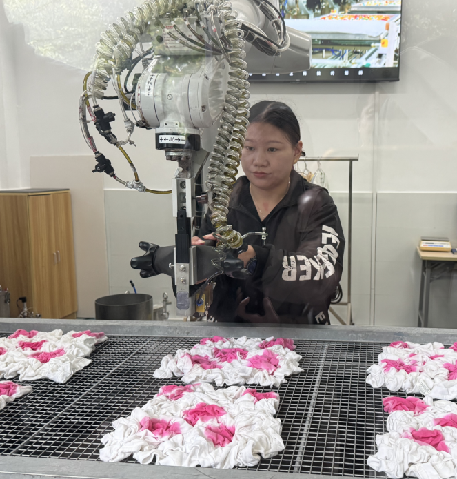 在华艺集团,非遗的现代化转型,也为文化传承者和当地从业者带来了实实在在的获得感。集团坚信,智能生产线不是为了取代工匠,而是将他们从重复、繁重的体力劳动中解放出来,让他们能更专注于创意设计和核心工艺。扎染技艺市级非遗代表性传承人邹莉如今的工作,从反复蘸染变成了“训练”机器人,她的经验与智慧以数据的形式被保存、复制和传承,赋予了千年技艺新的生命力。“科技的温度让我们这门老手艺走得更远,也让从事这门手艺的人更有尊严和希望。”邹莉感慨。