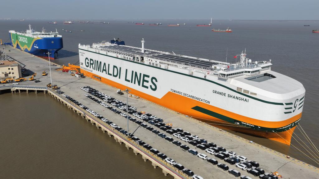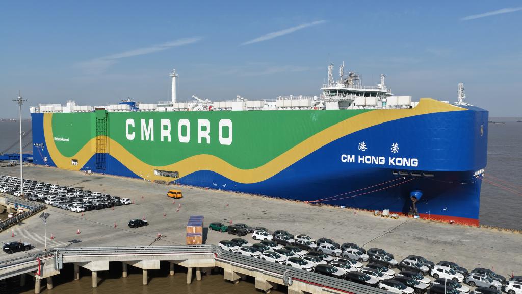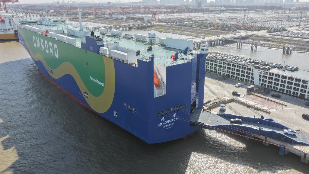 12月9日,在江苏省苏州港太仓港区,“港荣”号甲醇双燃料动力滚装船在装载出口汽车(无人机照片)。