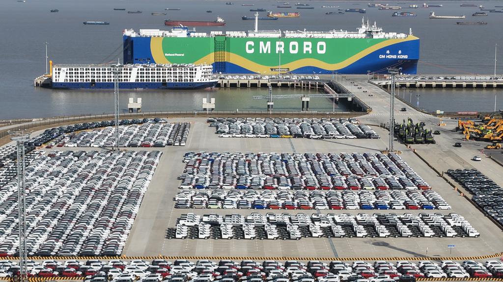12月9日,在江苏省苏州港太仓港区,专业汽车运输船在装载出口汽车(无人机照片)。