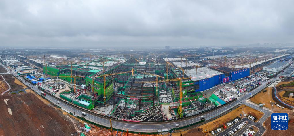 1月30日拍摄的南京北站站房建设现场(无人机全景照片)。