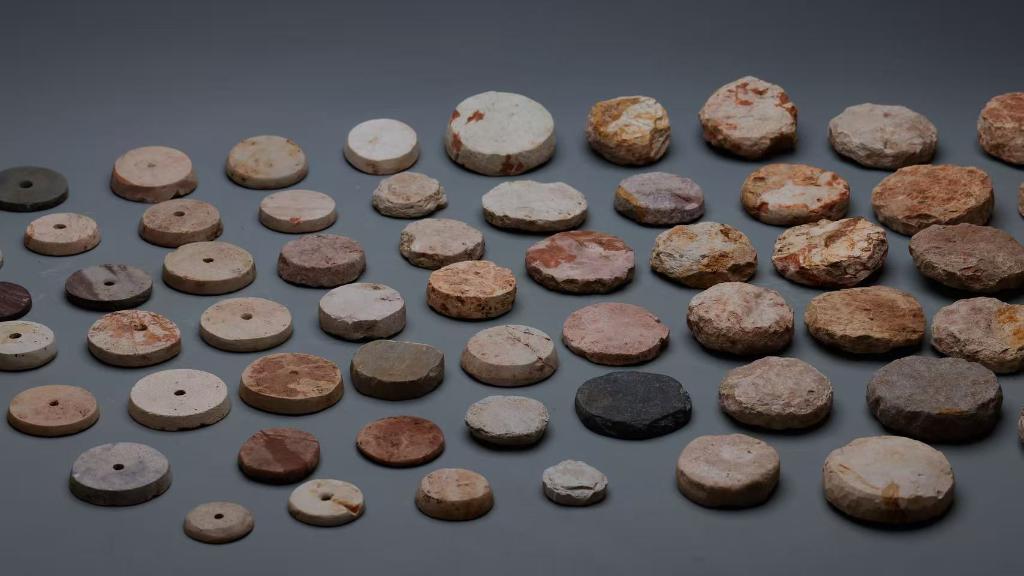 300多件,这是当前考古人员在斗山遗址发现的石纺轮数量。不仅如此,在城址西南部一座面积约200平方米的马家浜文化时期房址周边,还堆积着较多石纺轮毛坯料,俨然一座加工石纺轮的作坊。结合周边石料调查来看,石纺轮大部分为本地开采石料并加工生产。从采矿、加工到成品,一条完整的石纺轮“生产线”在约6000年前就已安排得明明白白。