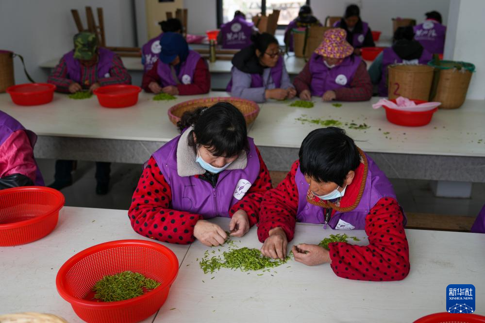 3月20日,在苏州市吴中区西山国家现代农业示范园金海华碧水缘茶叶基地,采茶工在挑选采摘的茶叶鲜叶。