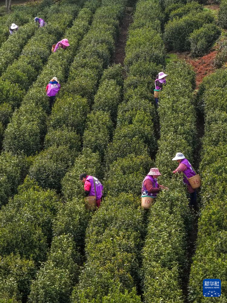 3月20日,采茶工在苏州市吴中区西山国家现代农业示范园金海华碧水缘茶叶基地的碧螺春有机茶园内采茶(无人机照片)。